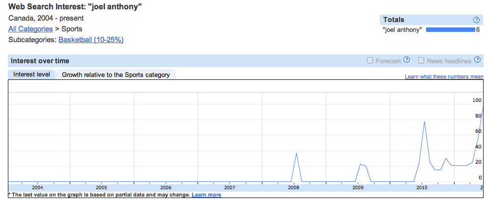 Another way to look at NBA Finals search trends is geographically. As you’d expect, foreign-born players are seeing interest spike in their homelands. Dirk Nowitzki is popular in Germany and Joel Anthony, a Canadian playing center for the Miami Heat, is generating lots of interest from Canuck hoops fans.